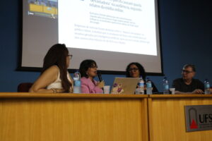 A coordenadora do Assimetrias, professora Kérley Winques, foi convidada a integrar a programação com a palestra de abertura, intitulada “Inteligência Artificial, o presente e os futuros do Jornalismo – ética, linguagem e disputas tecnológicas”. Em sua fala, Winques destacou como as infraestruturas digitais, os sistemas automatizados e a lógica das plataformas vêm reorganizando as práticas jornalísticas e produzindo novas disputas epistêmicas em torno da circulação da informação. Além disso, a pesquisadora também apontou para a necessidade de territorializarmos o debate sobre as IAs.
